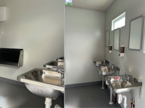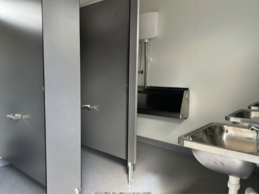 Modern ablution block for sale, designed for convenience, with 3 male toilets, urinal, and 2 womans toilets, perfect for worksites, events, or remote locations for immediate use.