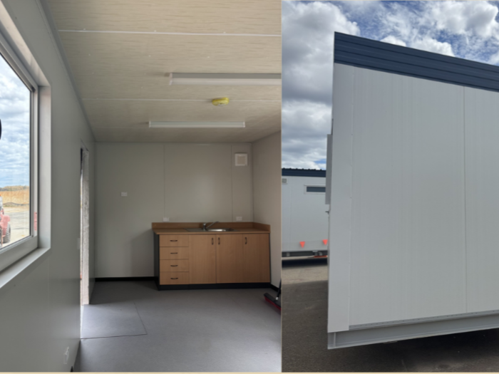 Modern office kitchen unit for sale featuring a versatile layout with dedicated workspace and fully equipt kitchen area, airconditioning, perfect for work sites, staff rooms, or remote locations and ready for immediate use.