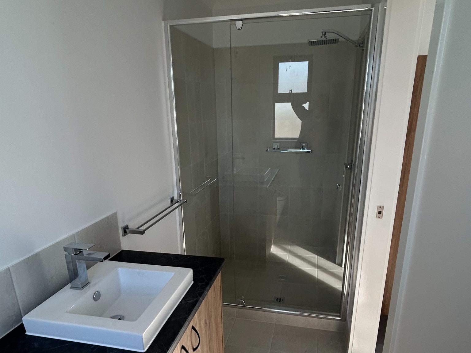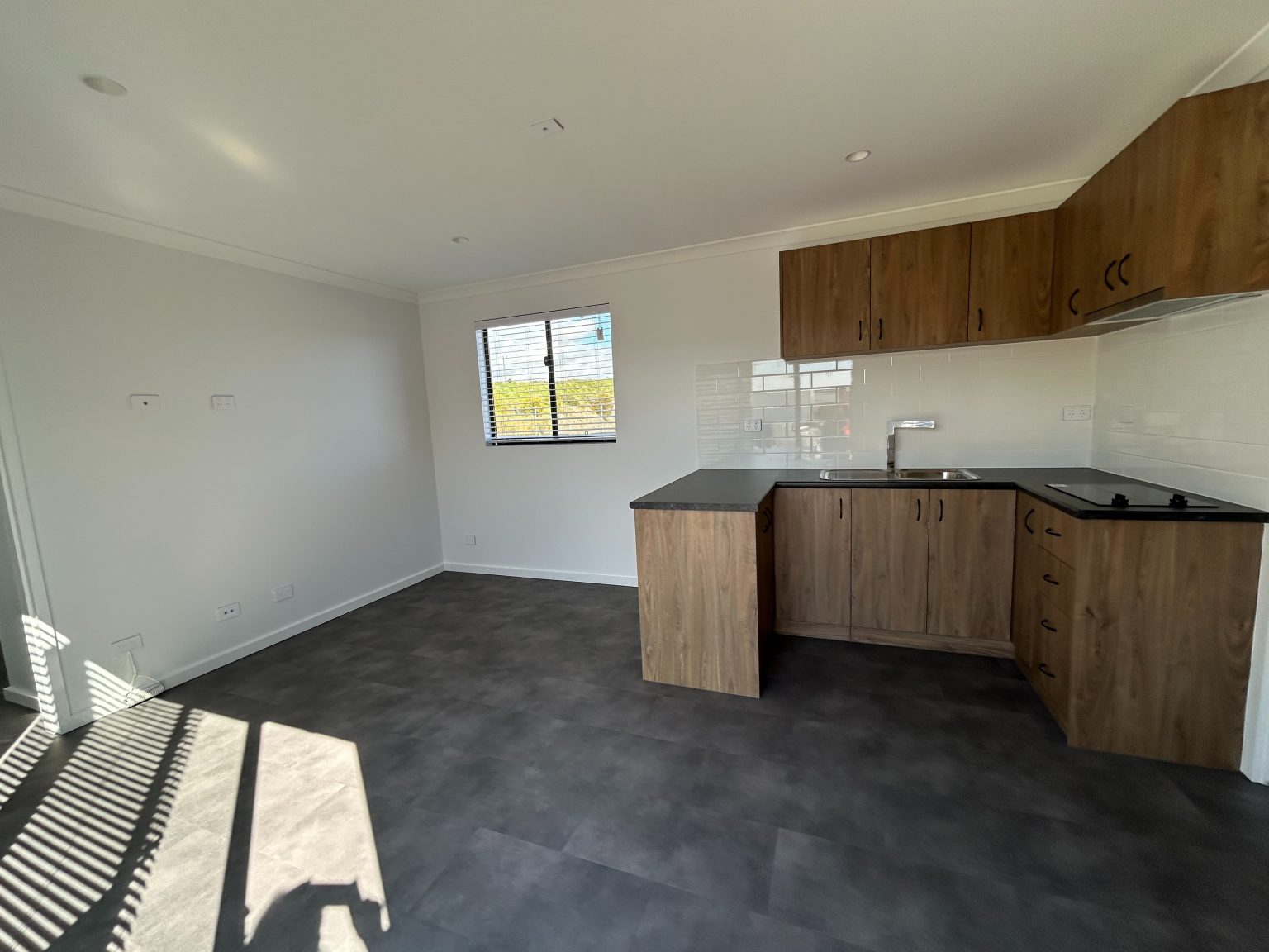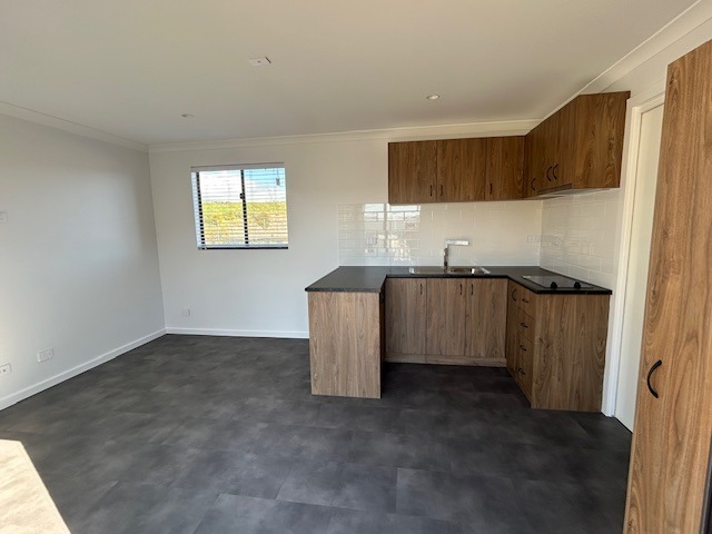 Stylish 1×1 granny flat in Region D featuring vinyl plank flooring, custom cabinetry, built-in robes, window furnishings, high-end fixings, induction cooktop, large sliding door, and a modern bathroom with glass pivot shower screen.